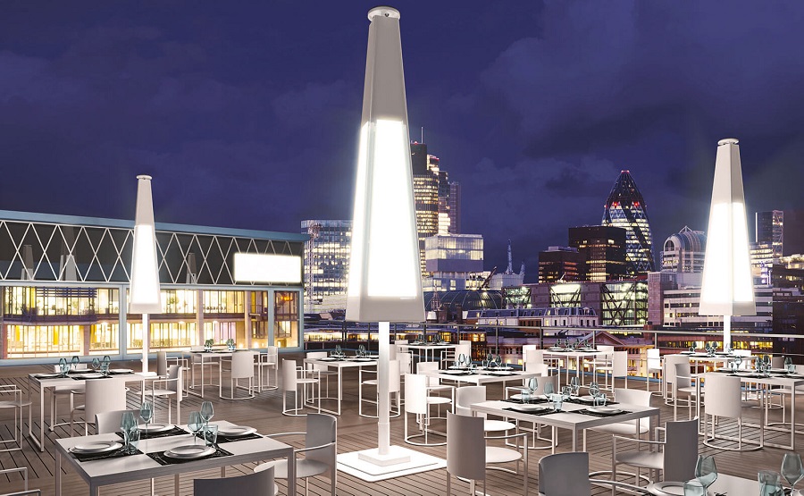 Da aperto arreda e protegge lo spazio sottostante dal sole e dalla pioggia; i pannelli retroilluminati ne permettono inoltre l’utilizzo anche di sera, senza necessità di sistemi di illuminazione addizionali. Da chiuso cambia la sua funzione trasformandosi in una lampada ornamentale dal design raffinato.